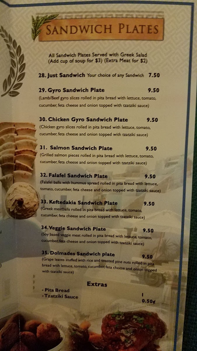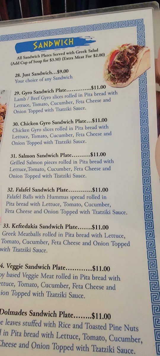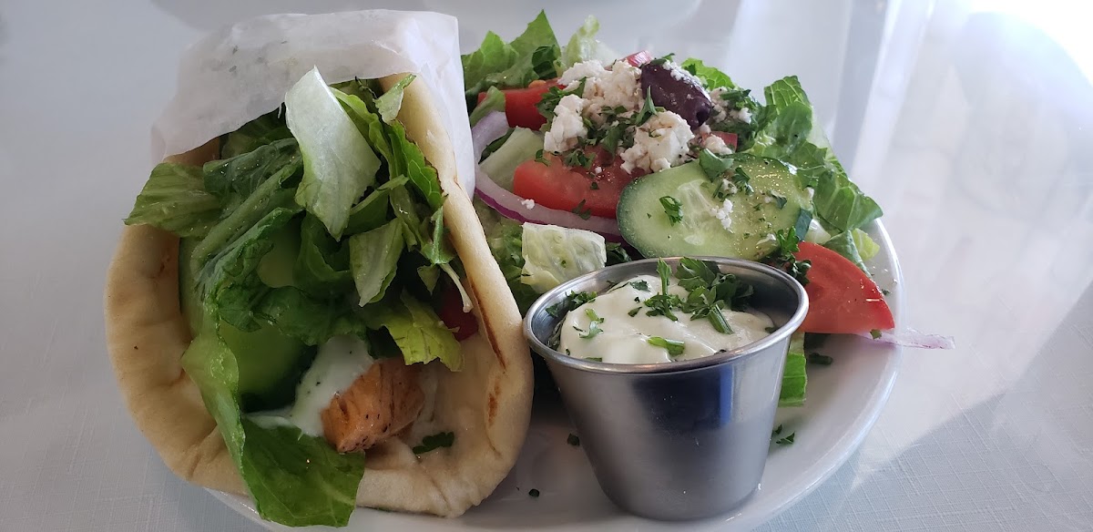 Athena Gyro’s menu offers a mouthwatering selection of dishes. The Chicken Gyro Sandwich Plate serves up tender chicken slices wrapped in fluffy pita, garnished with crisp lettuce, ripe tomatoes, refreshing cucumbers, feta, onion, and their signature tzatziki sauce. If you're in the mood for something vegetarian, the Dolmades Sandwich Plate delivers grape leaves stuffed with a savory blend of rice and toasted pine nuts, all beautifully wrapped and bursting with flavor. For those who crave a little crunch, the Falafel Sandwich Plate provides perfectly fried falafel balls nestled within soft pita, layered with vibrant veggies and sauce. Every bite is a celebration of flavors and freshness!